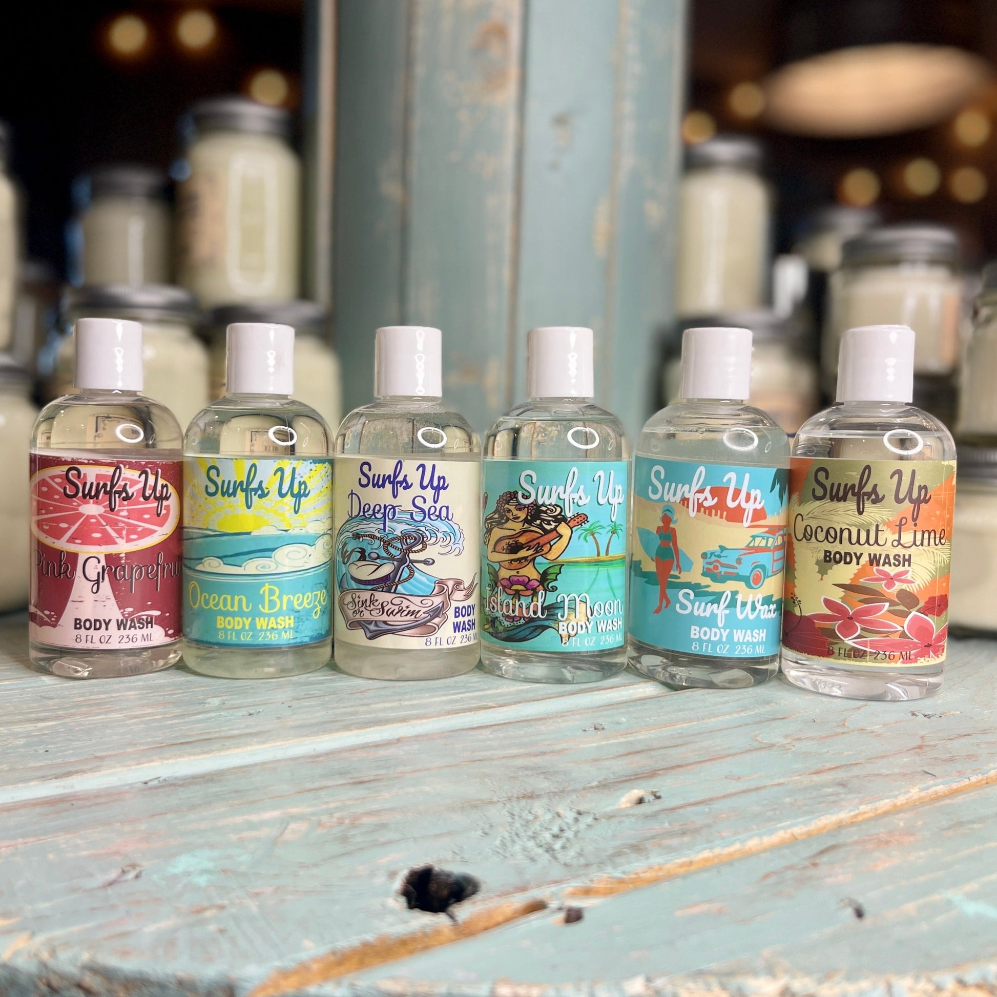 ◾8oz Surf Wax Body Wash Bottle: You'll love our signature scent with a pineapple base, iced lemonade, orange peel, grapefruit ,raspberry, frosted coconut water, fruity musk and raw vanilla. It will have you thinking of surfing, friends, family, and of course the beach.