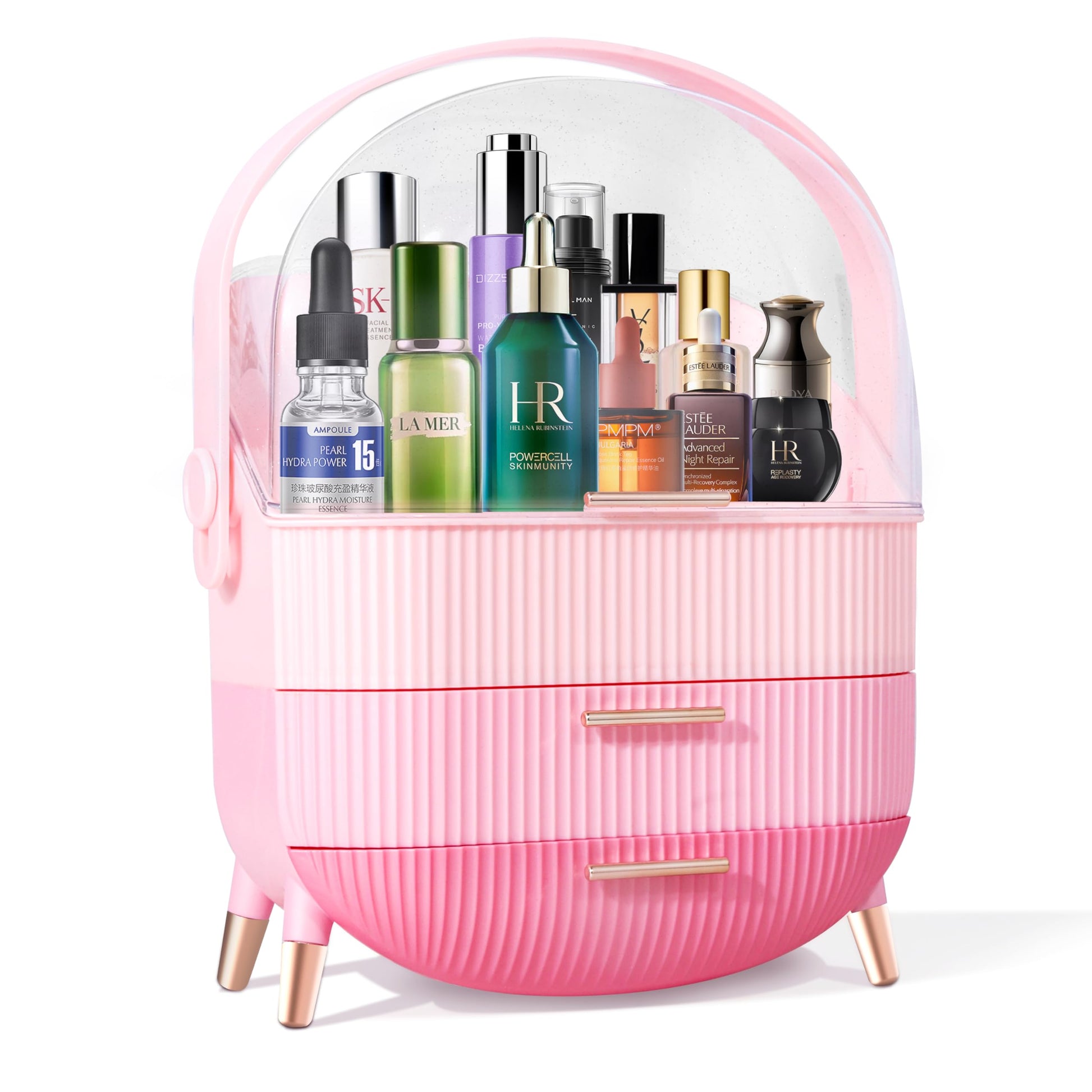 - 【Design】Egg-shaped cosmetic storage box[exquisite];portable handle[excellent];gold-plated handles and legs[beautiful];textured striped design[fashion].