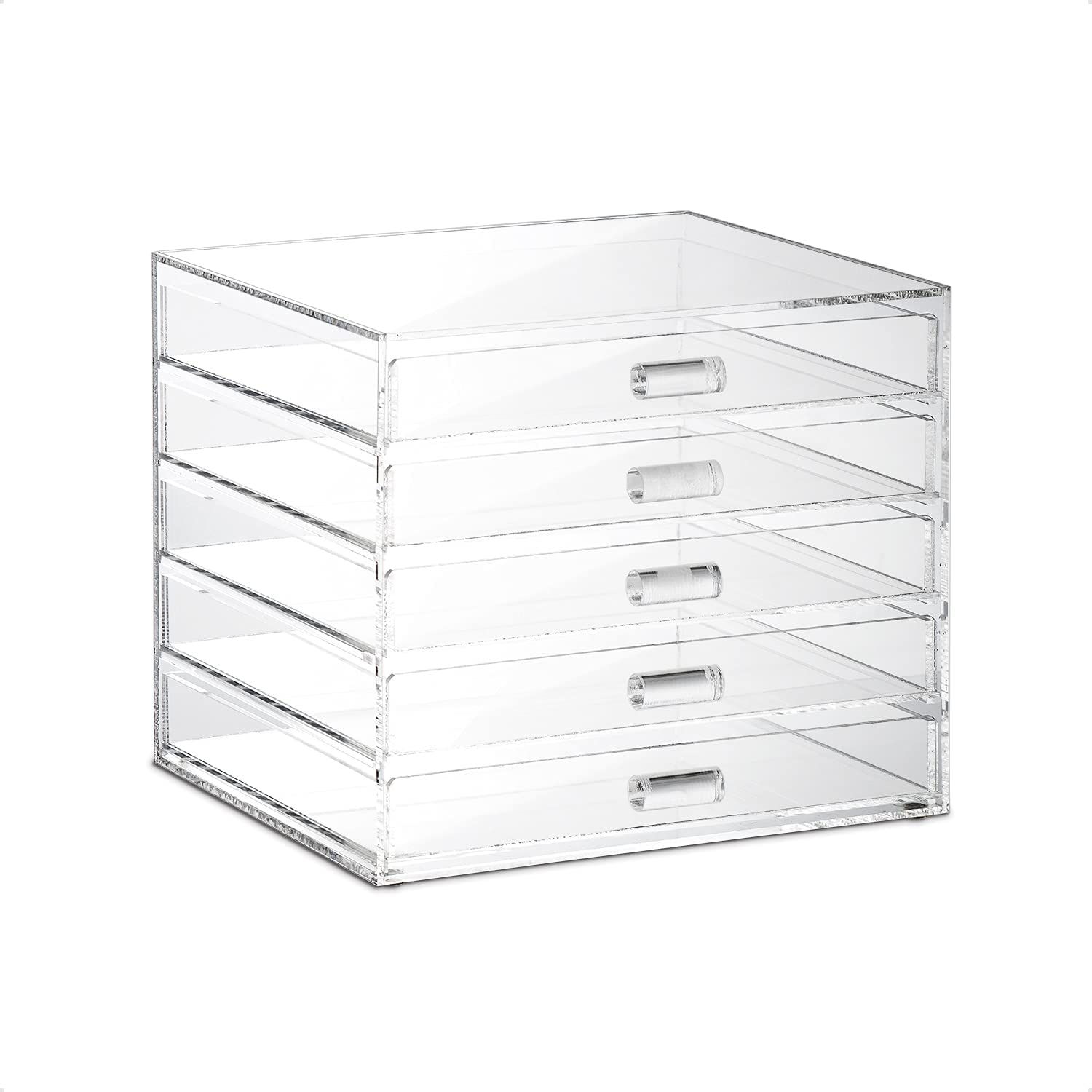 Ikee Design Large Premium Acrylic Jewelry Organizers with 5 Drawers, Acrylic Jewelry Box, Jewelry Display Organizer, Ideal for Vanity,Bathroom,Desktop, 8.5W x 7.25D x 7.25H in (No Pad includes)